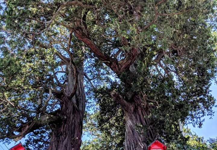 当初は参道の両側に5本ずつ植えられたものと思われますが、現在では社殿に向かって右側に4本、左側に2本が残っています。樹高は25m前後で、地上1.5mの幹回りは約5.05mを最大とし、小さいものでも約3.77m。いずれもサワラとしては宮城県内では稀にみる巨木です。サワラは、ヒノキによく似た日本特有の常緑針葉高木。宮城県は自然分布上の北限とされていますが、その北限地帯にこうした巨木が多く繁茂しているのは学術上貴重なことと考えられています。