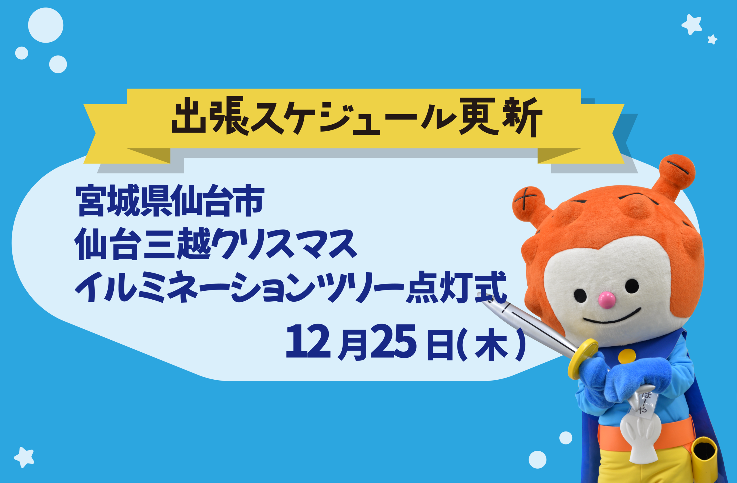 内容:光のページェントが華やぐ仙台の街並みを楽しみに、ホヤぼーやがサンタさんのお洋服を身に纏って仙台三越さんに遊びに行きます!