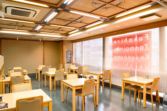 営業時間は6:30から9:00(最終入店8:30)。テーブル席と、障子で区切られた和室もある落ち着いた雰囲気のある会場でした。通常のテーブル席の近くには大きな窓があるので、朝の魚市場前の空気を感じながら朝ごはんをいただけます。