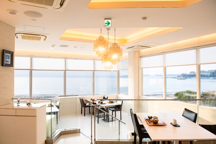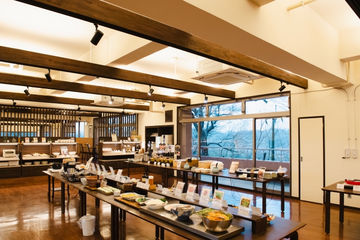 ビュッフェコーナーの奥にテーブルがあり、大きな窓から朝の光が差し込みます。気仙沼大島の自然や田中浜が一望でき、ゆったりとした音楽が流れているため静かに大島の景色を眺めながら朝食の時間を過ごせそうだなと感じました。