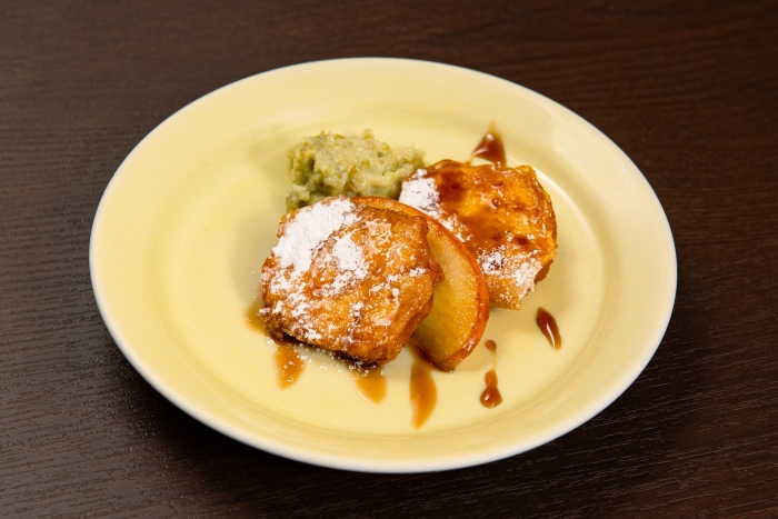 連泊される方が飽きないよう、小鉢のメニューは日替わりにしているとのこと。また、取材日に、汁物として赤魚の潮汁をいただきましたが、魚もその日によって変わるようです。船型の器に盛られた海鮮コーナーには気仙沼産の漬け鰹と「マンダイ」の刺身がありました。バラエティーに富んだメニューの中でもスタッフさんが「これは食べていただきたい!」とおっしゃったのが・・・休暇村でしか食べられない「仙台麩の麩(ふ)レンチトースト」。手作りのずんだホイップをたっぷりつけるのがおすすめとのことです。
