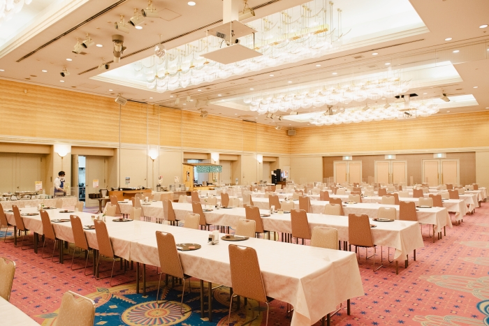 シックで落ち着いた雰囲気の会場です。外は道路がすぐ近くにあるため車通りは多いですが、内湾の朝の景色も楽しむことができます。テレビでニュースが流れており、どことなく懐かしさを感じました。