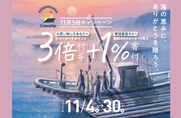気仙沼クルーシップでは、市内消費を盛り上げるとともに地域の生産者を応援するため、2025年11月 に加盟店全店を対象とした「気仙沼クルーカードポイント3倍キャンペーン」を実施します。期間中は通常の3倍(1%→3%)ポイント付与に加え、この期間の利用額に応じた1%分を気仙沼市に寄付し、市がガバメントクラウドファンディング分と合わせてカキ養殖施設等を支援します。今年7月30日に発生した地震による津波で甚大な被害を受けた養殖業を応援し、気仙沼の冬の味覚を未来につなぐ取り組みです。みんなで冬の気仙沼を盛り上げましょう!