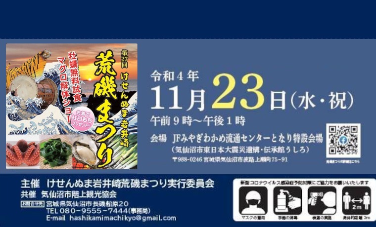 11月23日(水・祝) JFみやぎわかめ流通センターとなり特設会場(気仙沼市東日本大震災遺構・伝承館のうしろ)にて「第27回けせんぬま岩井崎荒磯まつり」が開催されます。
