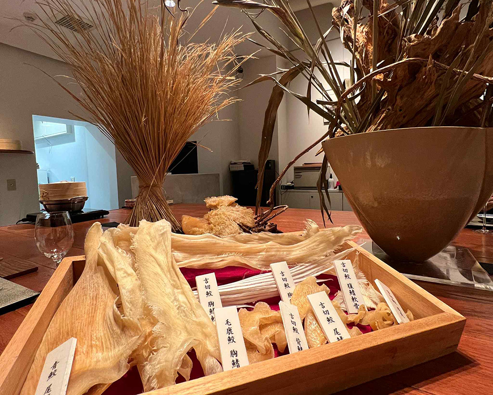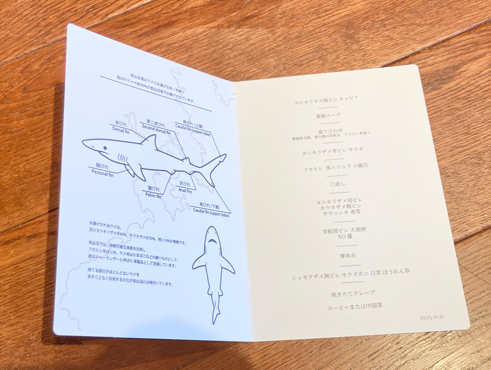 さらに、コースでは、サメの種類やヒレの部位を示すイラストが添えられたメニューが渡されます。お客さんはそれを見ながら、サメの身の部分が練り物や加工品に使われていること、革がシャークレザーとして活用されていることなどを知ることができます。そういった背景を伝えることも、フカヒレ文化を次世代に残していくための大事な一歩です。