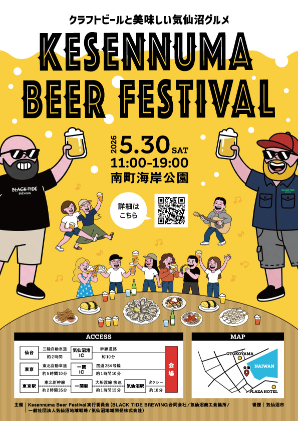 気仙沼発のクラフトビール「BLACK TIDE BREWING」のビールや、気仙沼のおいしいグルメを楽しめるイベント「KESENNUMA BEER FESTIVAL 2026」。スパイス香る料理やジューシーな焼き物、気仙沼ならではの海の幸を使ったメニューなどのビールに合うフードのほか、スイーツなど、バラエティ豊かなメニューが大集合!気仙沼のビアフェスで、わいわい楽しく盛り上がりましょう。