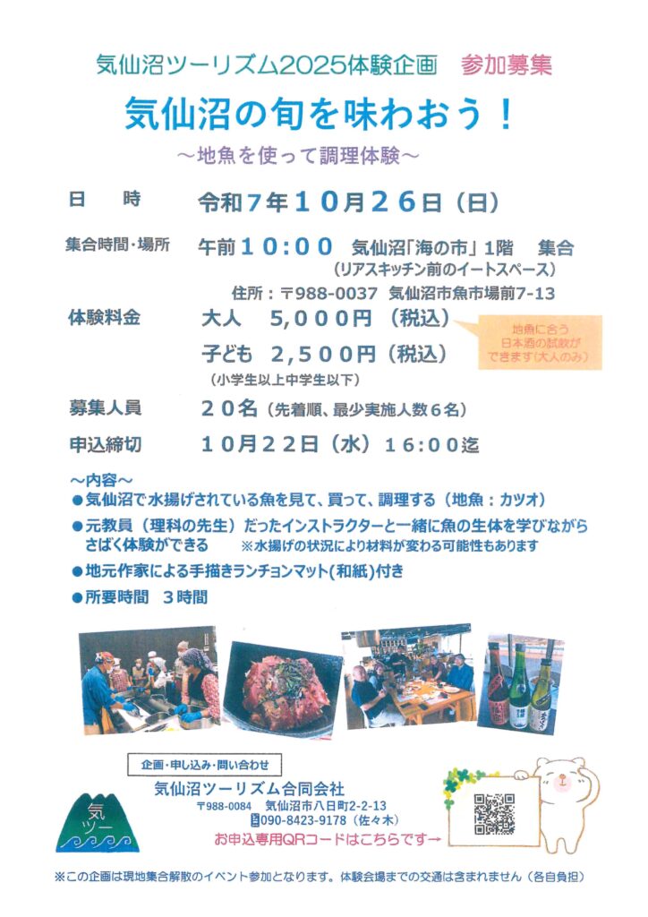 気仙沼ツーリズム2025体験企画として気仙沼の旬を味わおう!~地魚を使って調理体験~というイベントが開催されます!