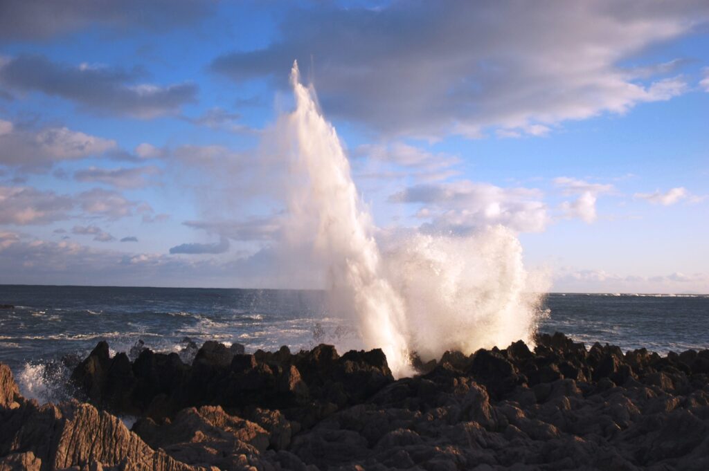 スタートは景勝地の岩井崎。長い年月をかけて海水によって浸食された石灰質の岩の割れ目から潮が吹き上がる光景や、岩井崎復興のシンボル「龍の松」などを見ることができます。