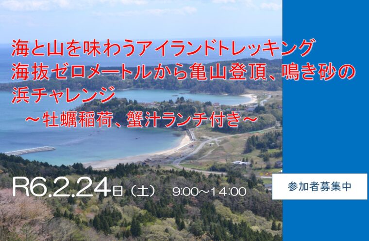 | 気仙沼大島ウェルカム・ターミナル集合 ~ 浦の浜漁港で海の水タッチにチャレンジ! ~ 小亀山登山口よりトレッキング開始 ~ 小亀山にて小休憩、亀山最後の急登へ ~ 亀山山頂の展望台より大島全景、リアスの海、また亀山テラスより雄大な太平洋を眺めます。 ~ 計仙麻大嶋神社を参拝。御朱印(事前申込者)を受け取り。※御朱印代は500円となります。宮司が不在の場合は別紙に書置きのものとなります。 ~ 十八鳴浜まで再び山道を歩きます。砂が鳴くかはお楽しみ!? ~ 海の見えるキャンプ場に立ち寄り、棟内で昼食 ~ 朝ドラのラストシーンとなった田中浜にて締めの海タッチ! ~ ウエルカムターミナルに帰着。 |