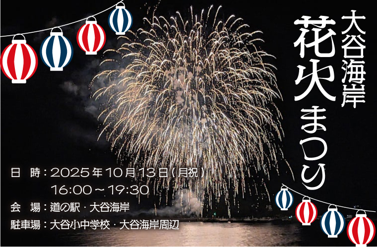 10月13日(月・祝)、道の駅大谷海岸にて「大谷海岸花火まつり2025」が開催されます。