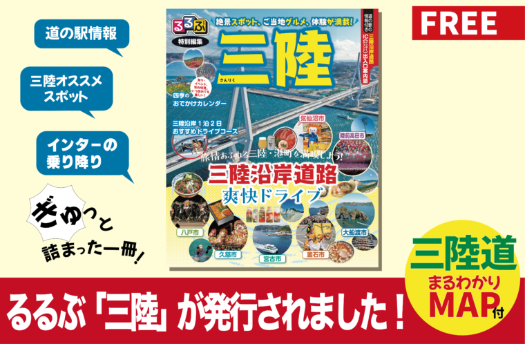 青森県八戸市、岩手県久慈市、宮古市、大船渡市、陸前高田市、宮城県気仙沼市の7市で、全線開通となった三陸沿岸道路をスムーズにご利用いただけるよう、共同で「るるぶ特別編集『三陸』」を発行しました。