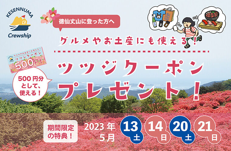徳仙丈山に登山した方に、気仙沼の魅力をさらに味わっていただけるよう、気仙沼の公式観光アプリ「気仙沼クルーカードアプリ」内で、期間限定で「ツツジクーポン」として、加盟店でご利用いただける気仙沼クルーポイント500pt(500円分)の特典をご用意しております。ぜひ、市内店舗で利用して、グルメやお土産など旬の気仙沼産品をお楽しみください。