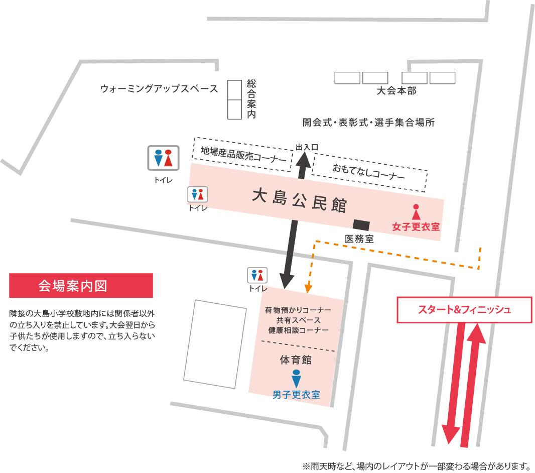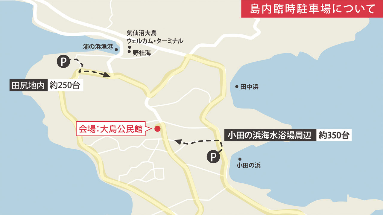 1.大島島内の臨時駐車場は以下のとおりです。駐車台数には限りがありますので乗り合わせでのご来場にご協力ください。利用時間は、いずれの駐車場も大会当日の7:00~14:00までです。