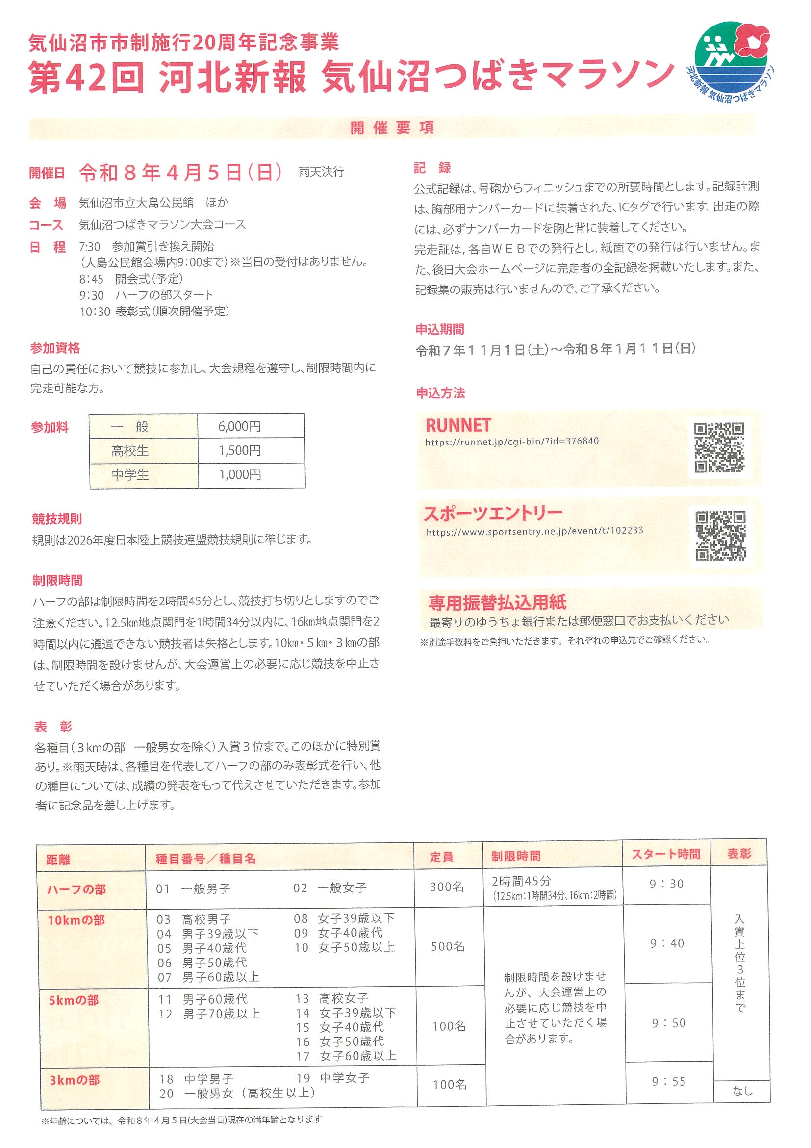 100名※10km、5km、3kmのコースでは制限時間は設けませんが、大会運営上の必要に応じ競技を中止させていただく場合があります。