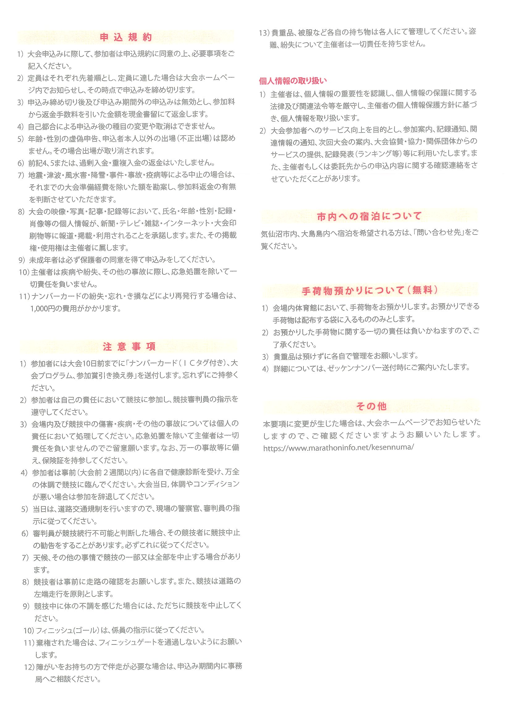 ※公式記録は、号砲からフィニッシュまでの所要時間とします。記録計測は、胸部用ナンバーカードに装着された、ICタグで行います。出走の際には、必ずナンバーカードを胸と背に装着してください。 完走証は、各自WEBでの発行とし、紙面での発行は行いません。また、後日大会ホームページに完走者の全記録を掲載いたします。また、記録集の販売は行いませんので、ご了承ください。 - 申込み受付