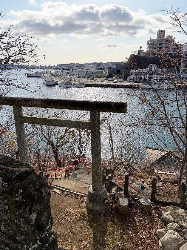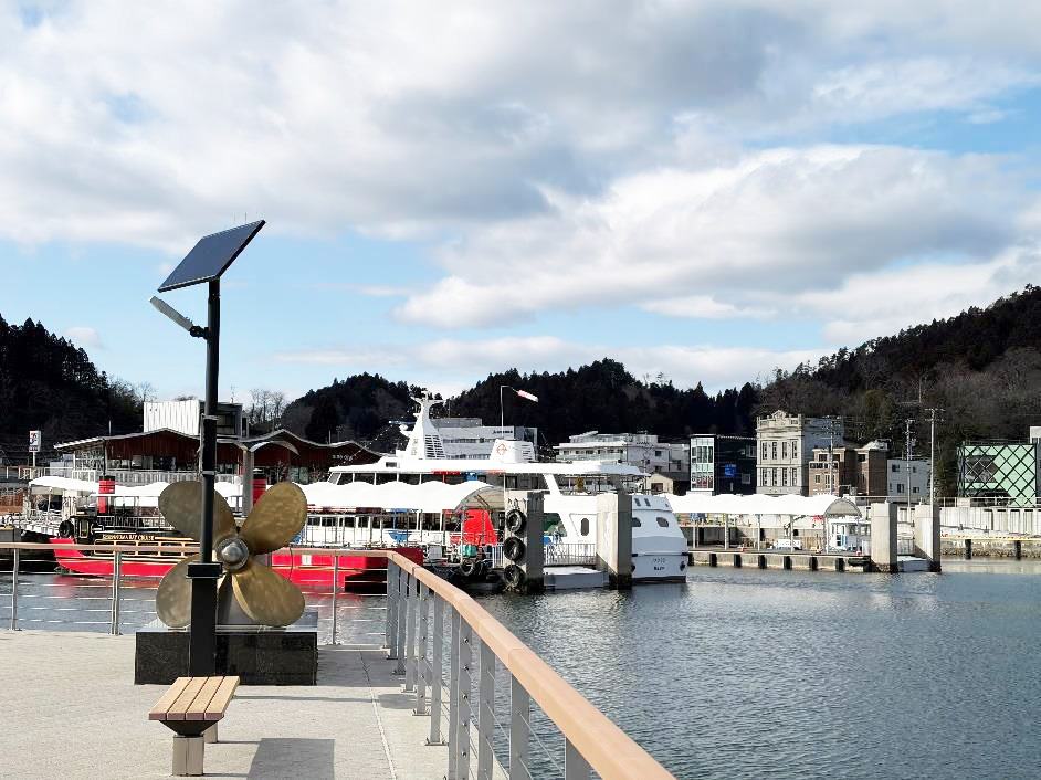 目の前には遊覧船乗り場。奧には安波山から続く丘陵の先端である岬、神明崎。その神明崎と向き合う対岸の岬は、まちのランドマークともいえるホテルのある柏崎。嵐の際には、 2つの岬が包み込むようにして、湾内に停泊する船を守る気仙沼の内湾は、リアスの地形を活かした、凪の時間が美しい天然の良港です。