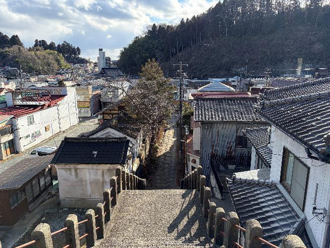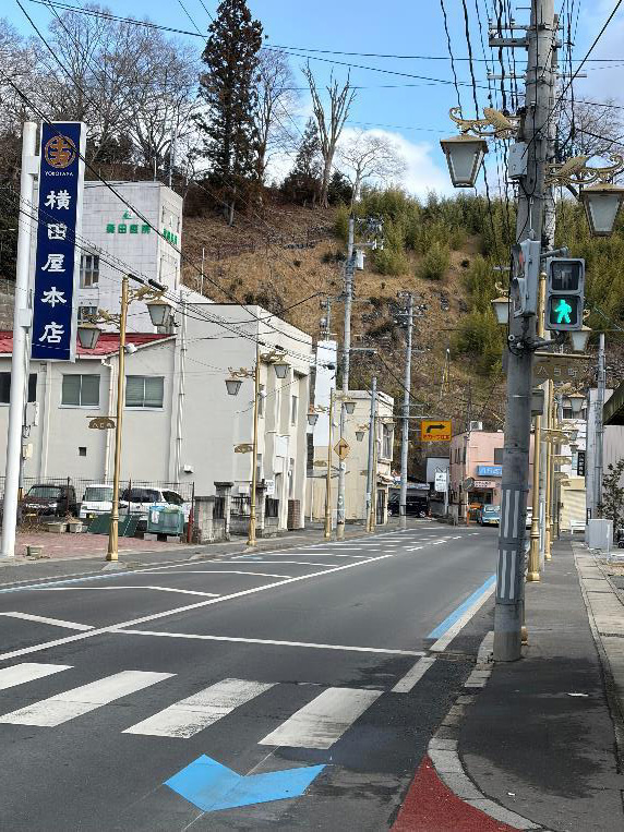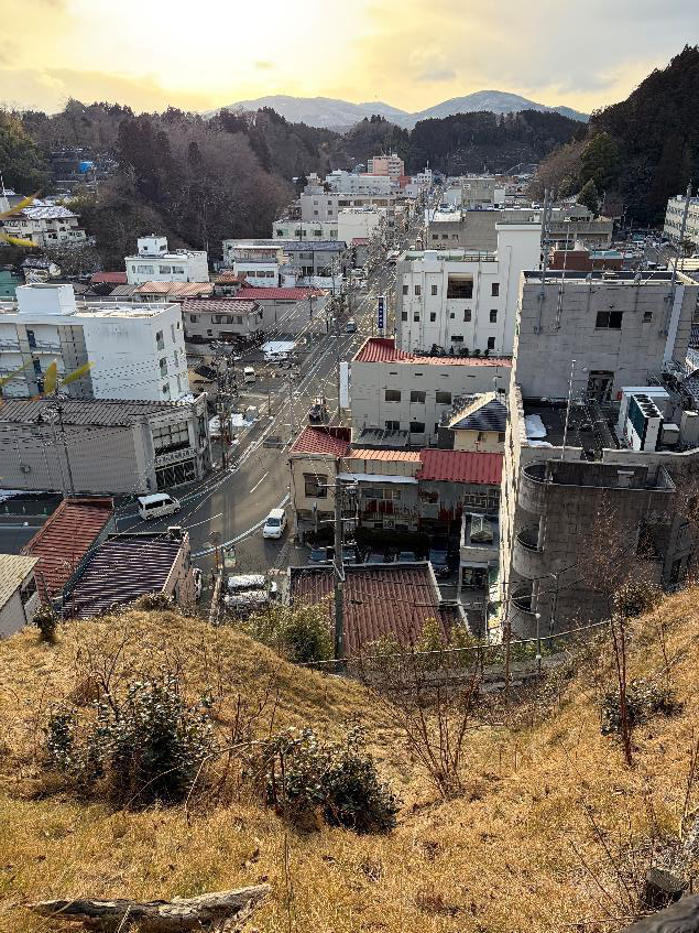 南町から続く一方通行の通りは八日町で県道 26 号とぶつかります。風は左折方向(北西) から吹いているようですが、一旦、右折して、ちょっとだけ「より道」を。まちのシンボル、 安波山から続く丘陵の先端、直角カーブが、かつて海に突き出した岬だった名残りである横 丁山に登ってみましょう。さて、横丁山から、八日町、三日町の通り(三八通り)を見下ろすと、