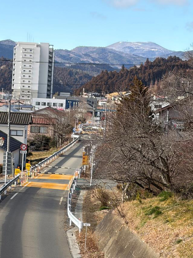 道は、一関方面に向かう国道 284 号と、仙台方面に向かう県道 26 号との三叉路に至ります。